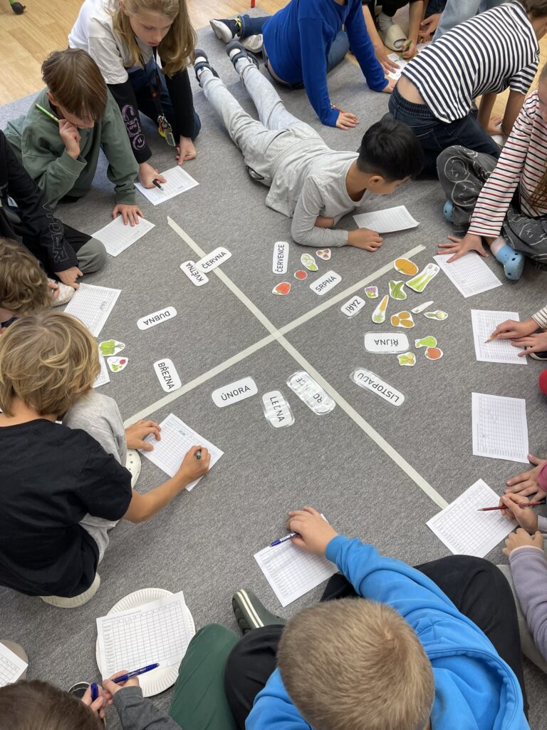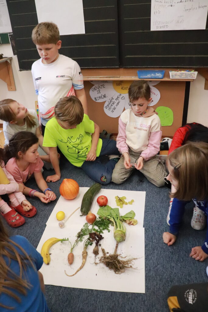 Na dalším stanovišti děti zkoumaly, co se sklízí v jednotlivých ročních obdobích, a starší žáci navíc zjišťovali, kolik kilometrů musí urazit ovoce a zelenina, než se dostanou na náš stůl.