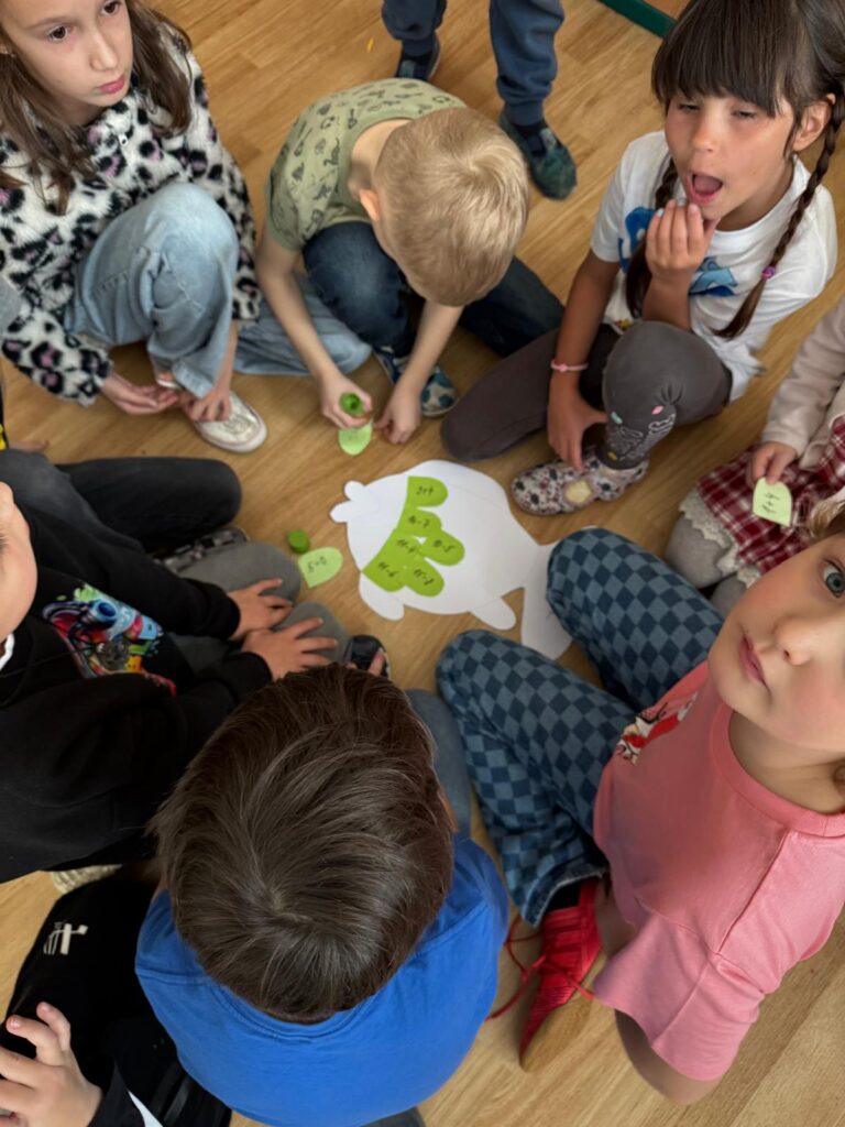 Součástí programu byla také zábavná matematická aktivita. Děti řešily jednoduché příklady a správné výsledky přiřazovaly papírovým kapříkům, kteří měli čísla umístěná na ocásku. Kapříky si pak společně vybarvily a jejich barevné výtvory už teď zdobí chodbu školy.