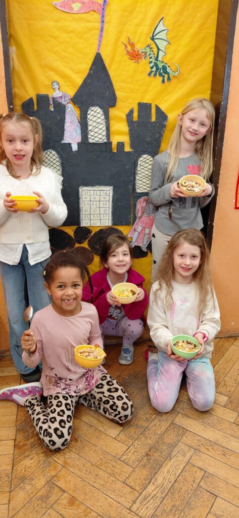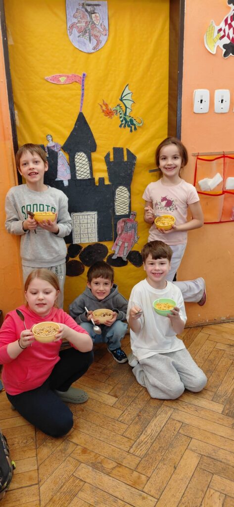 Únor se v naší družině nese v duchu středověku! Naši nejmenší se s nadšením pustili v družině do přípravy pokrmu, který byl ve středověku téměř každodenní součástí jídelníčku – kaše. Děti se dozvěděly, že nejčastěji se vařila kaše prosná, ale oblíbená byla také kaše pšeničná či ovesná.