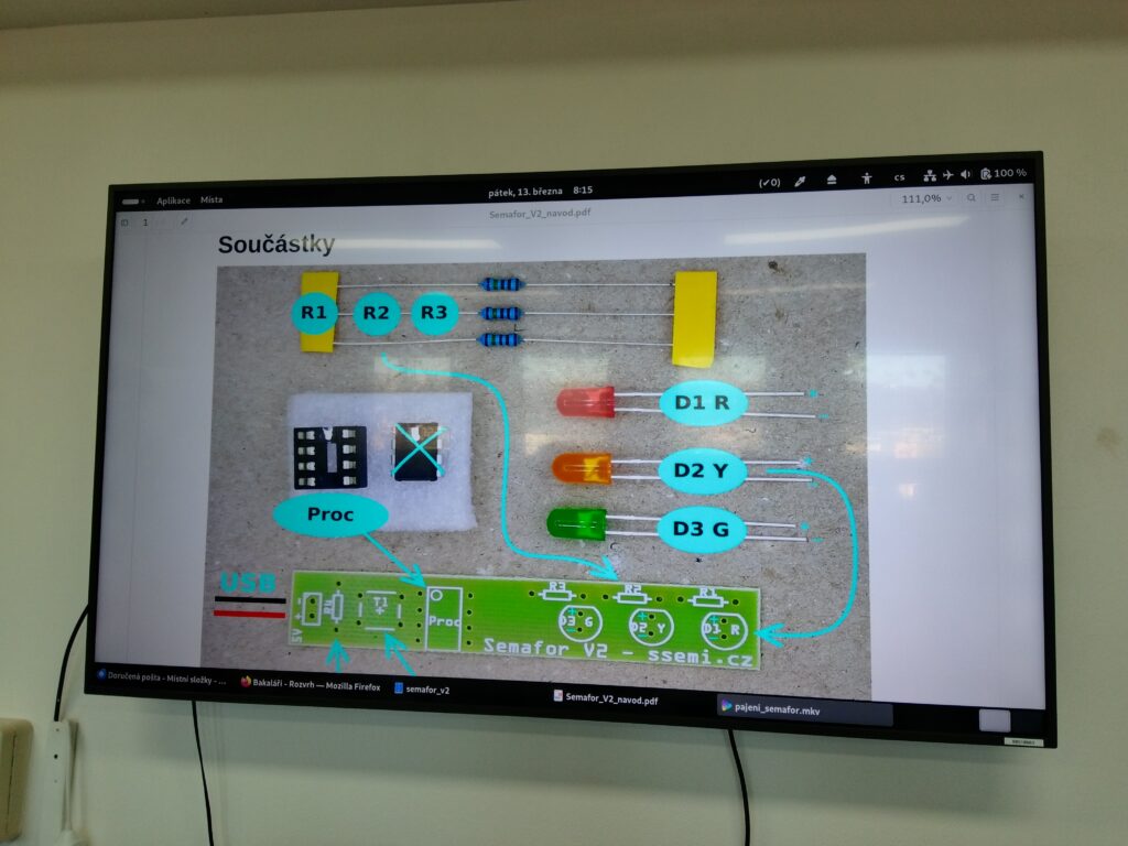 Minulý pátek si část osmáků vyzkoušela projekt, který velmi dobře ilustruje smysl těchto aktivit: výrobu mini semaforu. Nešlo přitom jen o mechanické sestavení. Žáci museli pochopit princip zapojení, orientovat se v základních elektronických prvcích a především naprogramovat chování jednotlivých světel. Výsledkem byl funkční model, který reagoval přesně podle jejich vlastního kódu. Taková zkušenost výrazně posiluje nejen technické myšlení, ale i schopnost řešit problémy a pracovat systematicky.