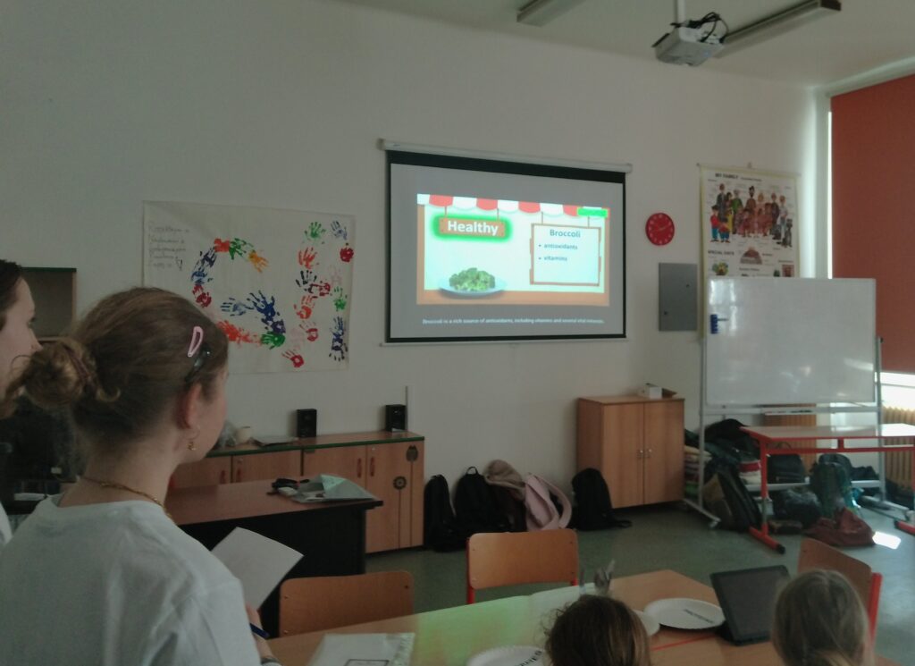 Možná by se zdálo, že o zdravém stravování se toho mluví docela hodně. Přesto plno z nás stále konzumuje potraviny, které nám spíše škodí než naopak. Tak kde začít, aby se to konečně změnilo? Určitě se shodneme na tom, že u dětí. A tak si část žáků anglického oddělení 8.B pozvala mladší spolužáky z 5.B do svojí „neobvyklé restaurace“. Proč neobvyklé? To proto, že v ní nebylo servírováno jídlo ale informace o potravinách a základních živinách. A to vše zábavnou formou a celé v angličtině. Žáci 5.B pak soutěžili v několika disciplínách za dozoru a pomoci starších kamarádů a nakonec si odnesli i malé odměny.