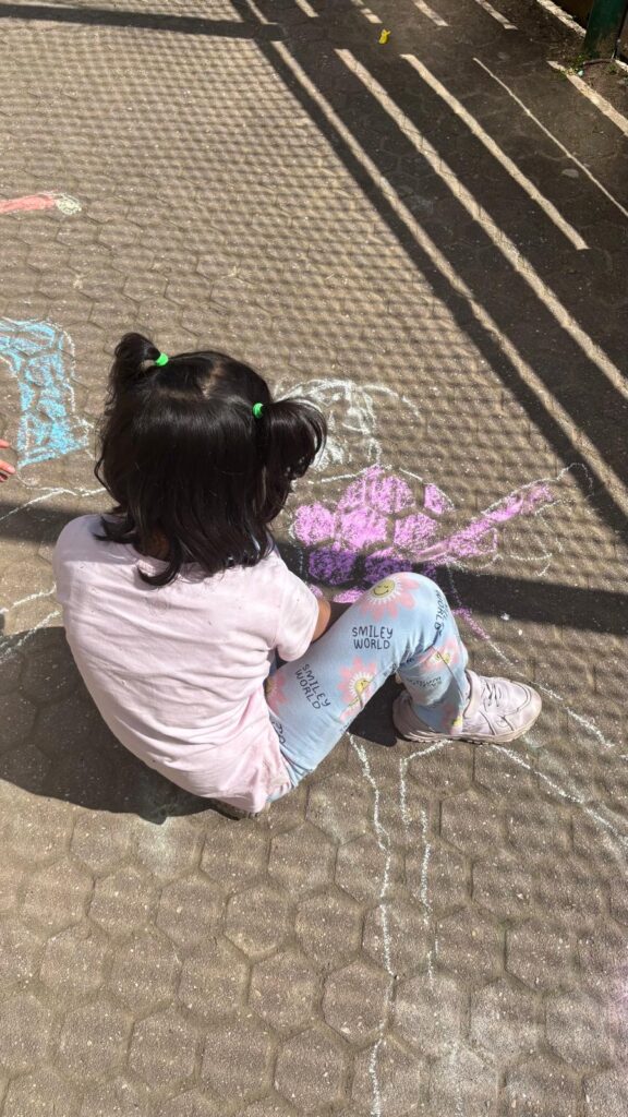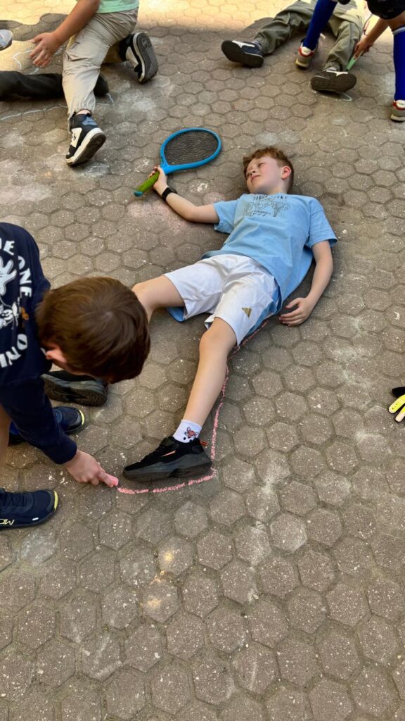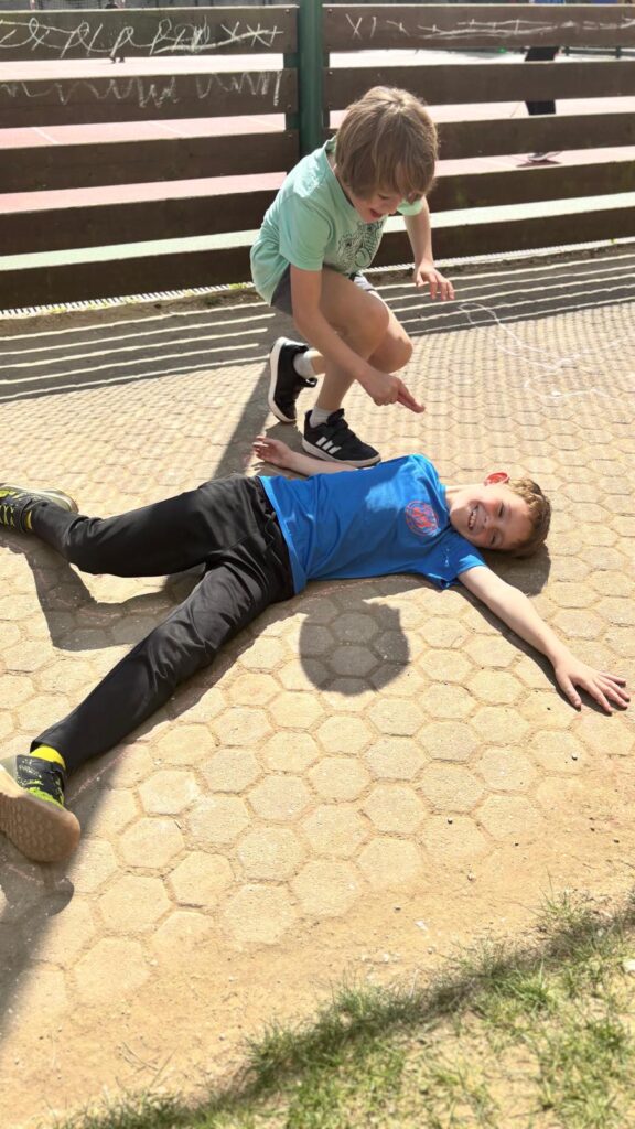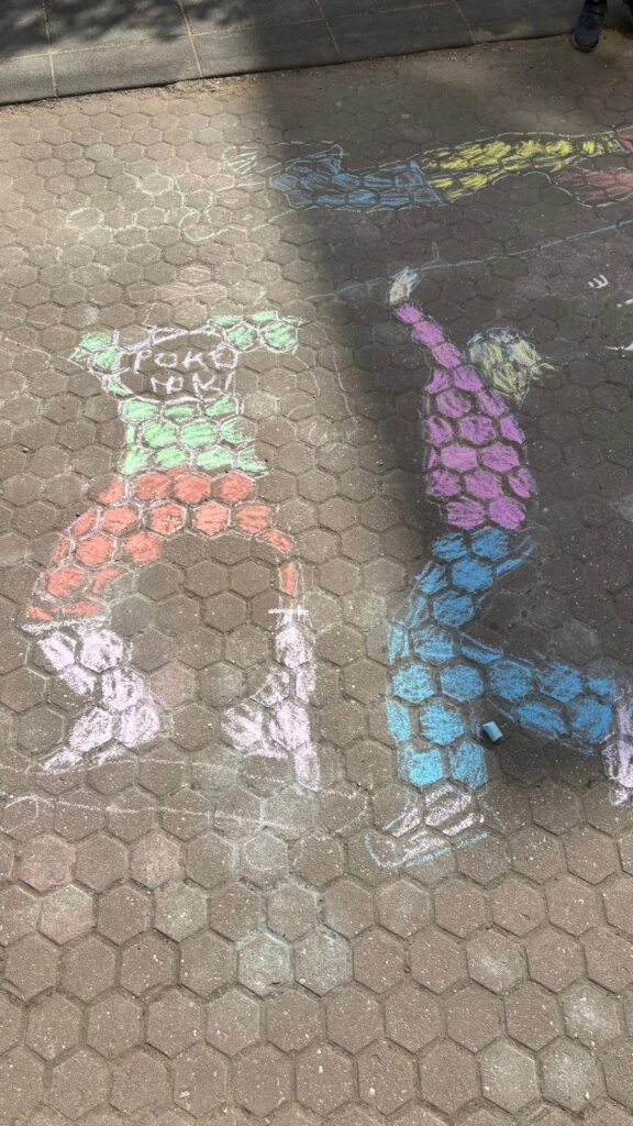 Základem celé aktivity bylo jednoduché, ale nápadité zadání: děti se navzájem obkreslovaly křídou na chodník tak, aby výsledná silueta připomínala sportující postavu. Už samotné hledání správné „sportovní“ pozice vyvolalo spoustu smíchu a nadšení. Někdo se proměnil ve fotbalistu v akci, jiný v gymnastku, běžce nebo třeba hokejistu. Kreativitě se meze rozhodně nekladly.
